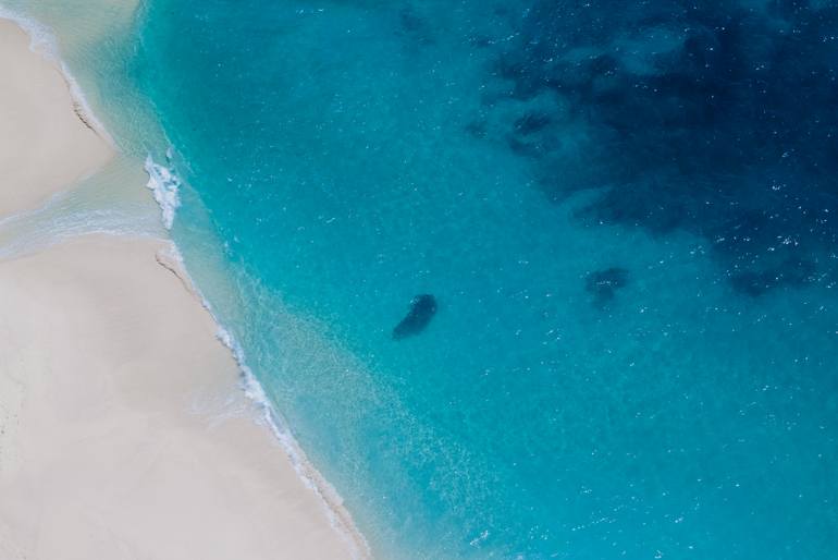 Seen from above, the meeting of ocean and shore becomes an exercise in clarity and proportion. The expansive light blue surface dominates the frame, while a narrow line of white sand marks a quiet boundary between land and water. Soft, luminous tones dissolve any sense of drama, presenting the ocean...