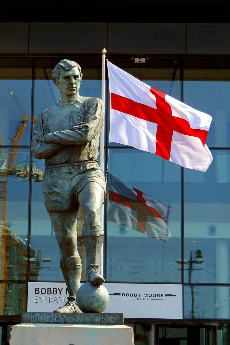 Bobby Moore Statue and The St George's Cross England Flag outside Wembley Stadium England United Kingdom photography by Andy Evans Photos. Limited edition prints are processed using Hahnemuhle Baryta fine art paper. A bright white based, acid-free and lignin-free paper benefiting from a high-gloss p...