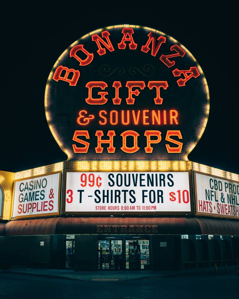 Bonanza Gift Shop neon sign at night, Las Vegas, Nevada - digital photographic print by travel photographer Jon Bilous