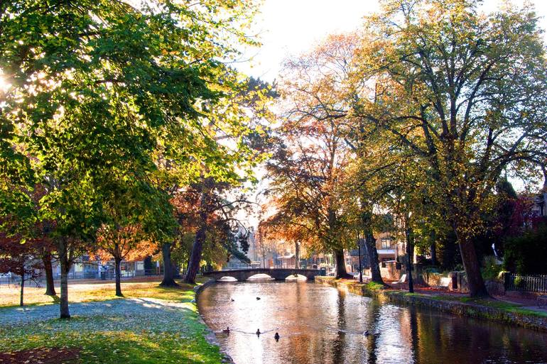 Autumn trees and the river Windrush in Bourton on the Water Cotswolds Gloucestershire England United Kingdom photography by Andy Evans Photos. Limited edition prints are processed using Fine art Giclée printing this guarantees best results and longevity using the latest, professional archival Epson ...