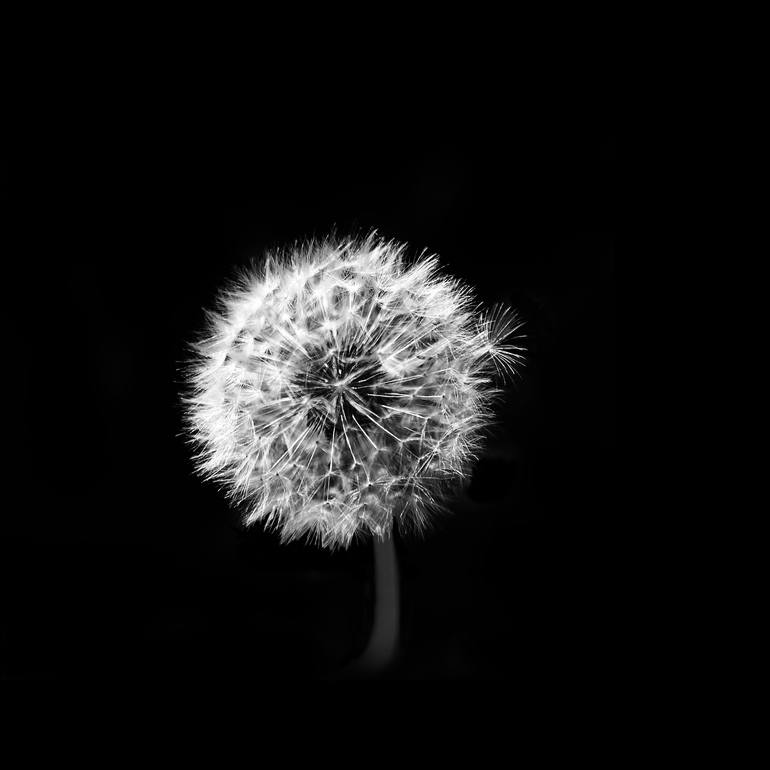 A single seed begins to pull-away from the rest of the intact dandelion seed-head. The orb glows white in early evening sunlight against a pure black background. This version is square. Also available in portrait orientation.