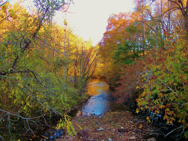 Color Photo of a Fall Evening with the Tree's Changing colors & a Beautiful Bubbling Brook running away .
