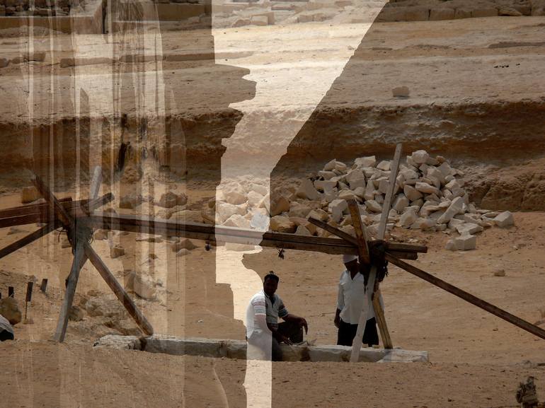 An author photograph taken in Egypt and made with a double snapshot. Two workers engaged in the splitting of building stones. Una fotografia d'autore eseguita in Egitto e realizzata con un doppio scatto fotografico. Due operai impegnati nello spacco delle pietre da costruzione.
