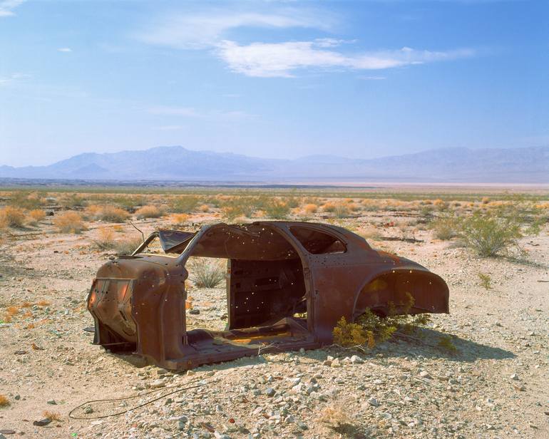 I've been photographing Route 66 ruins since 1980, and never run out of new subjects...well, new old subjects! I found this scene near Amboy CA on the old Route 66. The bullet riddled car was probably a practice target, but its rusting nobody sitting in the desert made an interesting photo. The hig...