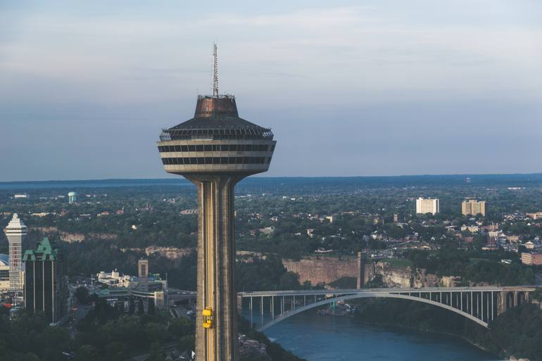 Bullet to the Top A bright yellow elevator zooms to the top of the Skylon tower overlooking the beautiful Niagara Falls in Ontario, Canada Website: Instagram: Facebook: fb.me/AlexTonettiPhotography Pinterest: