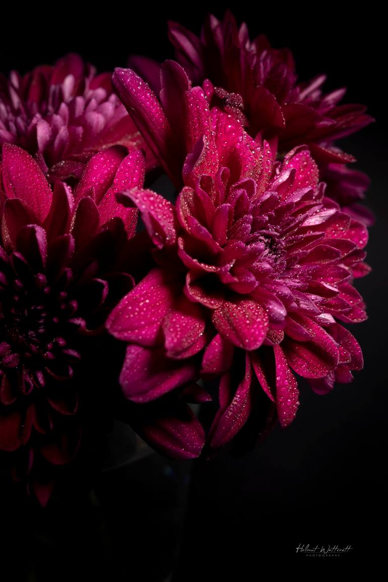Burgundy chrysanthemum flowers with dew drops wall art Photograph