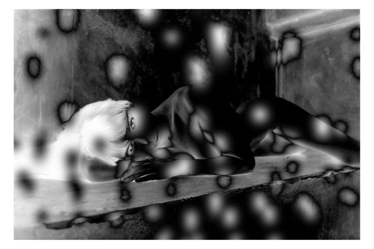"Burning Gaze" is a black and white photograph blending the delicate human form with radiant Chinese lantern light. This artwork, captured on traditional 35mm film, features a nude woman in a prone position, her body appearing as a dark silhouette that starkly contrasts against the bright, luminous ...