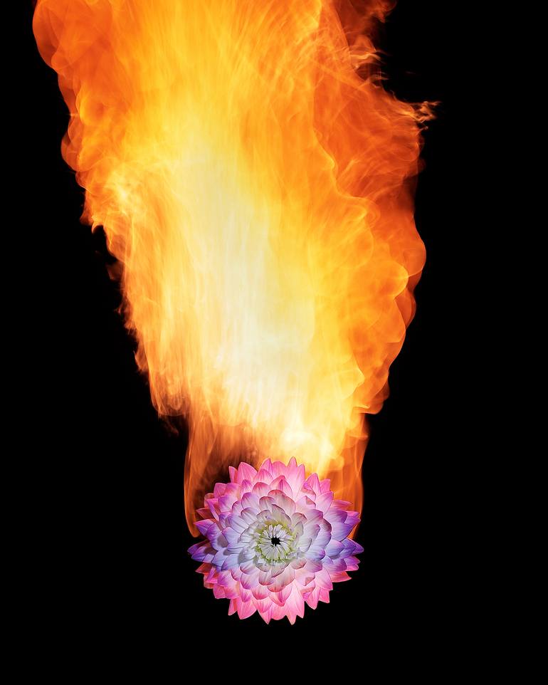 Colorful flower as it goes up in flames showing the delicate balance of nature. Printed on Luster Archival paper with a 1" white border Signed