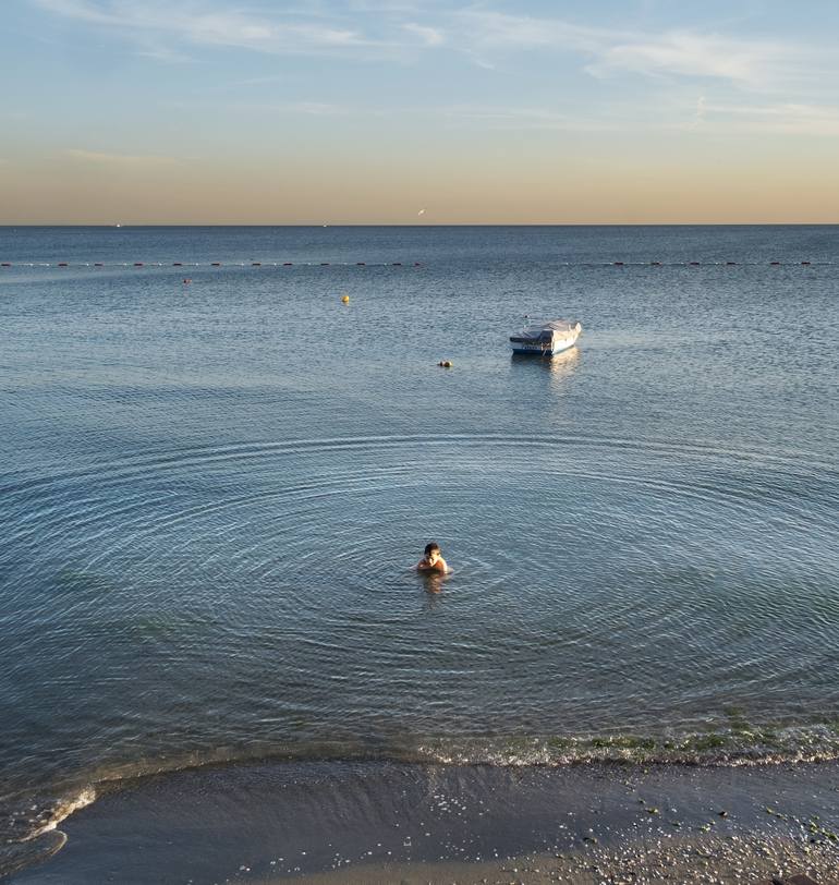 Büyükçekmece, town in Turkey with beautiful beach. Boy swimming in calm sea under closely watch his father.