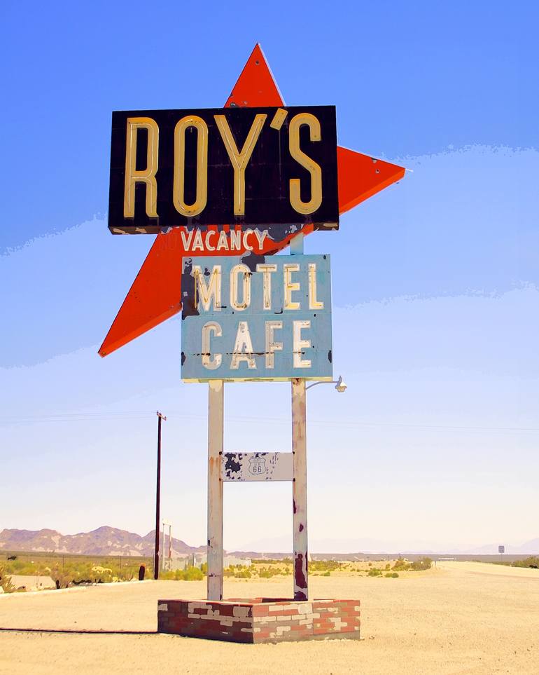 The classic historic landmark Roy's Motel and Café along the famous Route 66 located in Amboy California, captured by photographer William Dey. "Retro Vision" Art Exhibition ACE Palm Springs Art Museum Satelite Show Desert Art Center Palm Springs, California. The Motel's iconic retro sign, against...