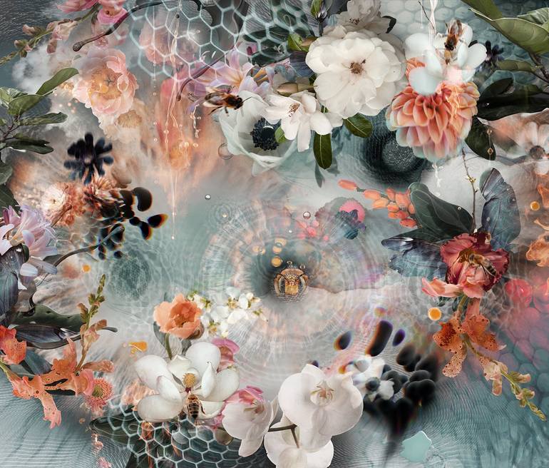 the work is inspired by the intelligence of nature. This piece focused on the vibrations of the bees and the hive, forming a vortex that units all to the eye of the Universe