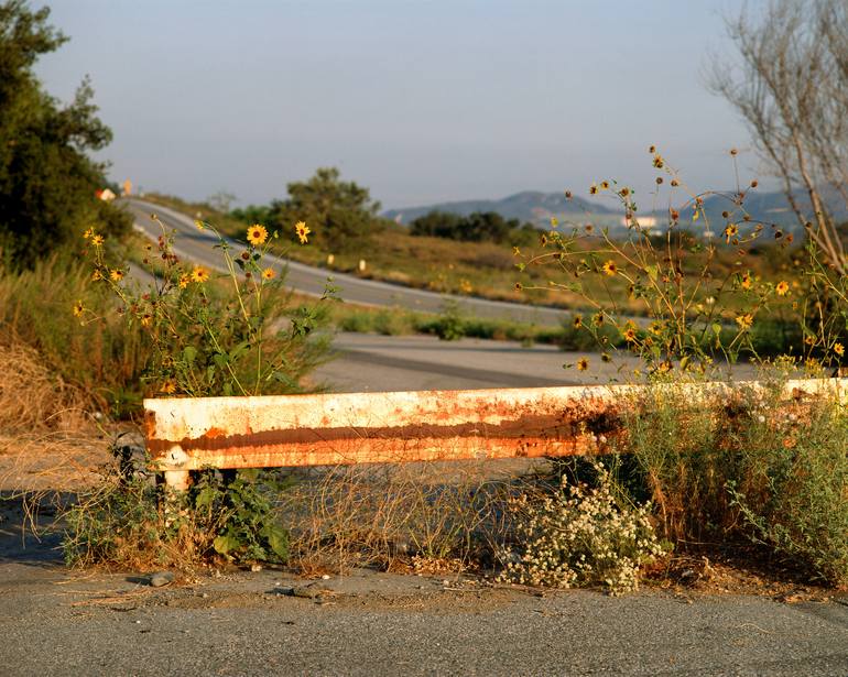 I've been photographing Route 66 ruins since 1980, and never run out of new subjects...well, new old subjects! Former Route 66 lurks in the background as a rusting guardrail blocks transportation on an even earlier Route 66 path. Wildflowers surround the guardrail, which apparently worked dilligent...
