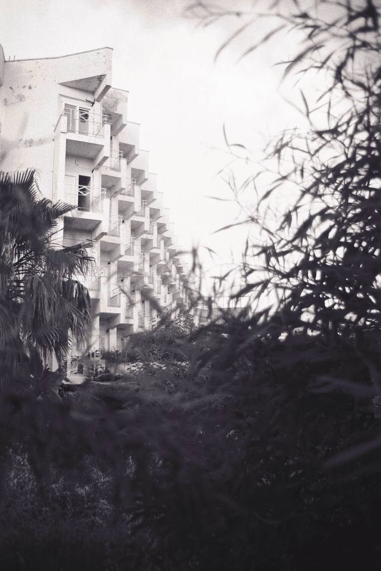 This black and white photograph explores the tension between modernist architecture and the encroaching natural world. Shot through a veil of vegetation, the stark white apartment building with its geometric grid of balconies creates a compelling visual contrast with the organic, chaotic forms of th...