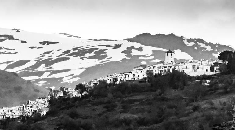 A telephoto view from below the Spanish village in Las Alpujarras. Image pixel grain helps to make the image graphic with high contrast. The snowy mountain appears to dominate the village.