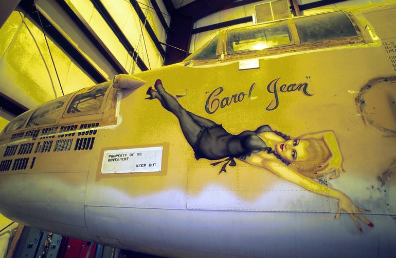 In storage for decades. 'Carol Jean' was state of the art during WWII. Many planes of all types were given names and Nose Art. A Classic lives on.
