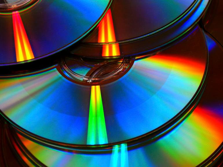A collection of compact discs reflects in a spectrum of light with vibrant colors, overlapping in a cascading arrangement.