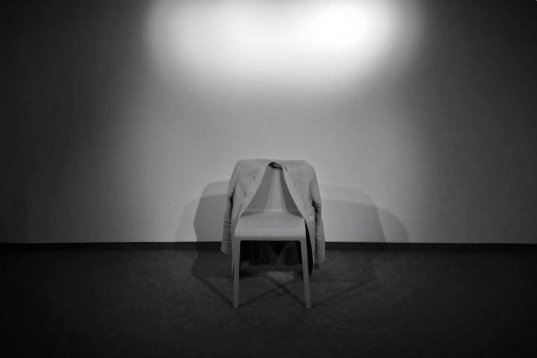 "Emptiness and Mystery" This black-and-white photograph creates a melancholic atmosphere, conveying a sense of waiting and irretrievability. The jacket on the chair seems to speak of someone who was there but has left, leaving behind only a memory. This is a digital expression of my original painti...