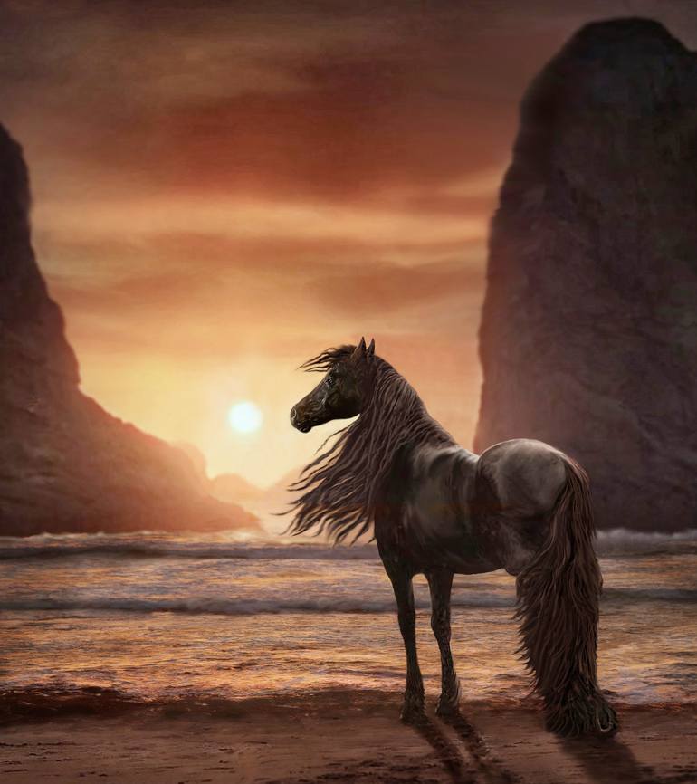 This beautiful Friesian stallion is part f a composite. i wanted a majestic horse watching a sunset. It is made up of 7 images. The integrity of the direction of the light had to work. Enjoy