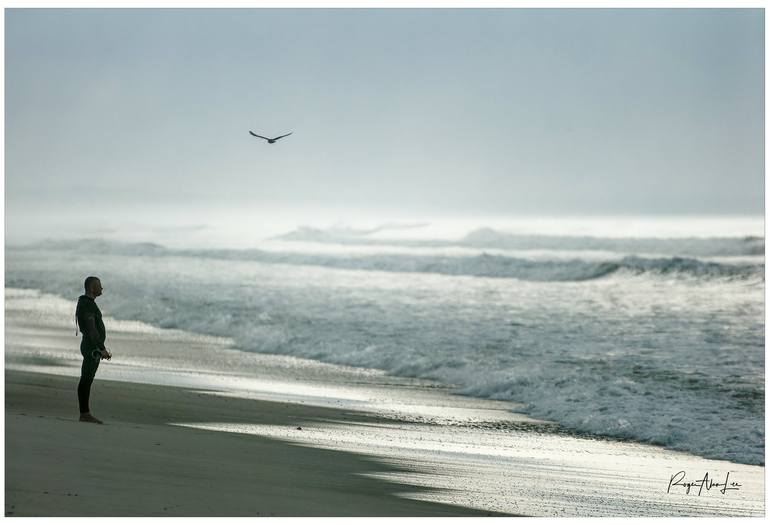 It is early morning on Muizenberg Beach in the Western Cape and there are numerous surfers at this popular venue. Just to one side, I see this solitary surfer. All by himself, just standing contemplating the sea and thinking - about the waves or about life? I love this artwork as there are so many i...