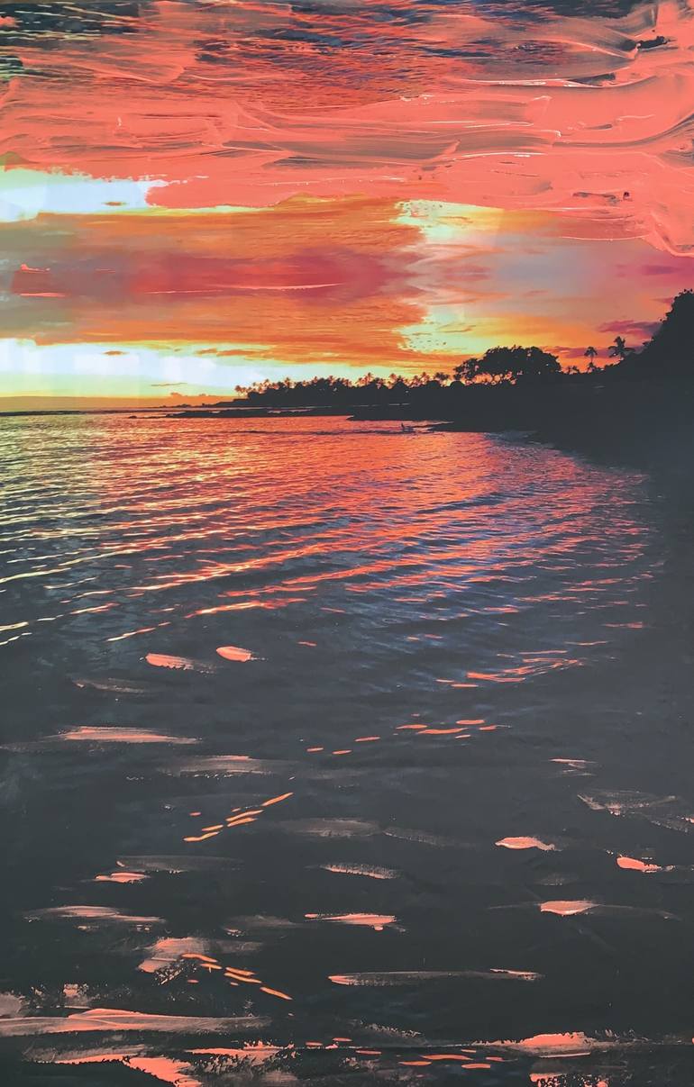 This is a photo of the sunset at dusk over a coral reef. The bright orange sky is mirrored in the clouds and water below. This is printed on organic cotton and then painted on with a neon coral paint for a textural effect that pops out on this box framed image.