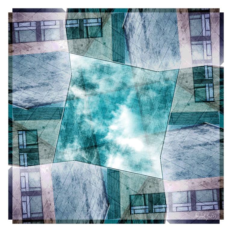 This digital composition merges photographs of building facades and clouds into a single geometric plane, evoking the visual language of cubism. The abstract artwork depicts five distorted courtyard perspectives that are seamlessly flattened and interlaced, forming a kaleidoscopic structure that dra...