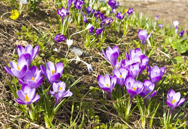 First spring flowers purple crocuses on ground, photograph. Artistic produced limited edition prints of 100 pieces. Excellent printing quality. Printed on 100% natural cotton canvas 340 g /m2 with a pronounced texture. Eco-friendly ink without odor and harmful substances. Printing on the Canon iPF8...