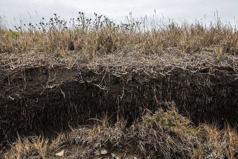 Along the Strait of Juan de Fuca on San Juan Island, Washington the soil that has built up over thousands of years of plant life living and dying. At the edge of the island above the water where the bedrock is exposed the soil gets washed away to reveal a cross section of the soil between the grassy...