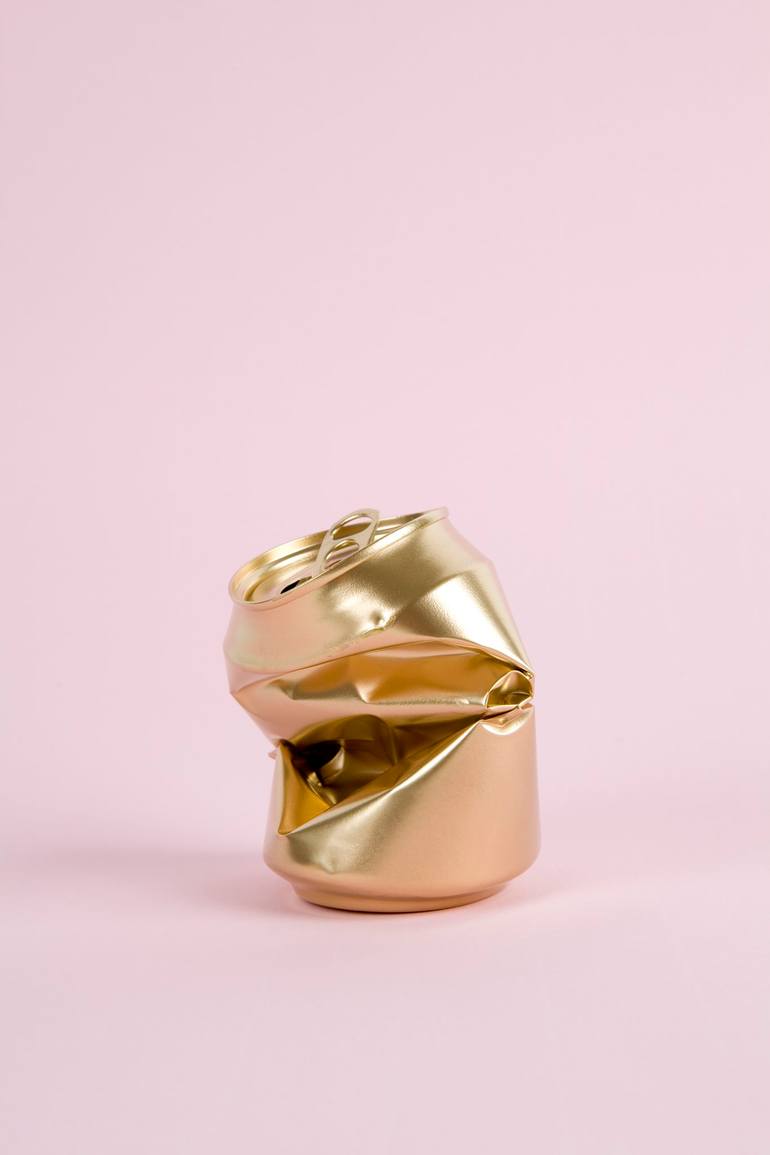 A crushed can of soda painted in gold on a colorful background. Minimal color still life and quirky photography. • • • Original printed with 10mm margin Print certification available