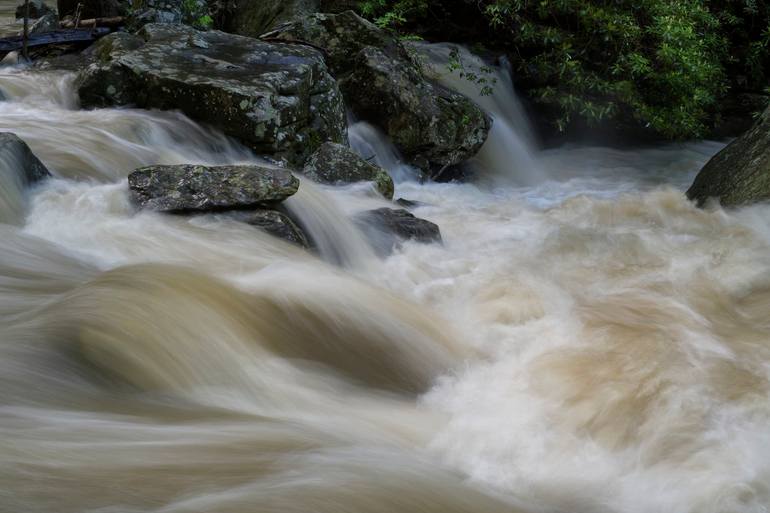 A swiftly flowing river cascades over large rocks, creating a dynamic and turbulent scene. The surrounding greenery adds a sense of calm to the powerful movement of the water. This photograph was taken yesterday just after sunrise, following heavy rains (and, a tornado warning!) the night before, an...
