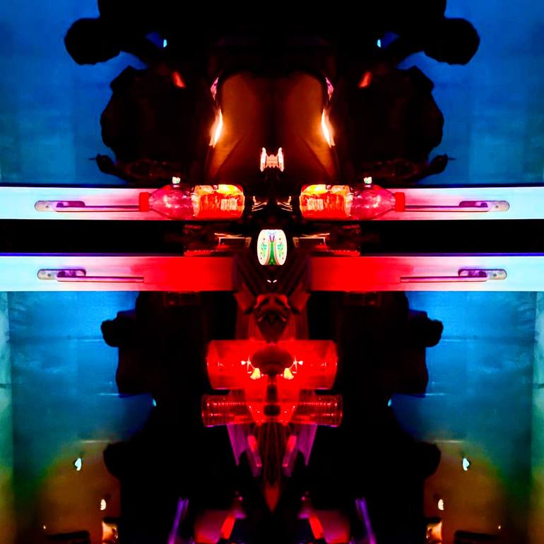 "Cyber Deer" is a digital print that merges symmetry and vibrant color to evoke a sense of mystery and futuristic calm. In this piece, a combination of neon greens, pinks, and purples forms abstract shapes, creating a layered, mirrored composition that subtly suggests the outline of a deer. The blen...