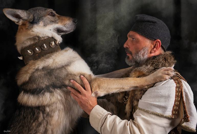 This striking portrait captures the bond between a man and his wolf-like dog. The artist masterfully reconstructs a scene reminiscent of ancient Dacian warriors, highlighting the enduring theme of camaraderie. The baroque style and photorealism create a visually rich and emotionally resonant image. ...