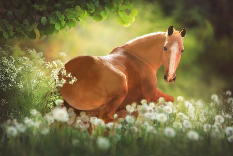 Sterling's Gold is a beautiful palomino Tennessee Walking horse. He loves to lay in the flowers in the spring and summer. The mud in the winter. LOL. He is full of personality. His barn name is Trigger. The original is a loose canvas.