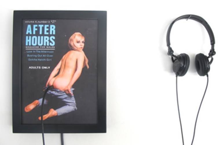 DANIEL CHERBUIN PLUG IT IN!, 2011 26.5 x 35 cm audio length:16m42s, forex printed board, wood frame AP 1-3, Editions 1-10 This artwork is AP 1 of 3 Original German text below HUMOR KALAUER POINT Kalauer is when a display with the photo of a pin-up from the sixties with the words "After Hours" wo...