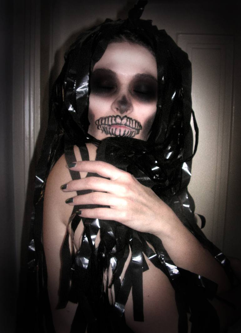Digital print, memento mori self-portrait. Exquisite corpse and gothic apparition dancing in the dim light of a limbo.