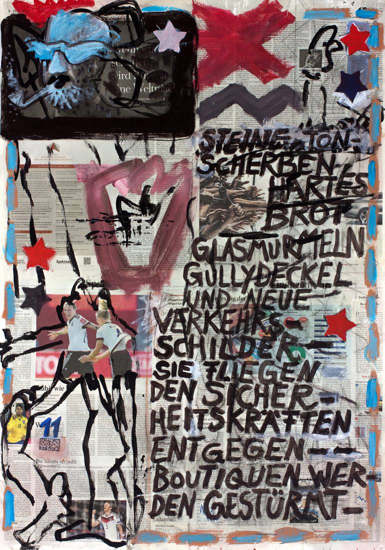 Collage Newspaper Collaboration Since the 1980s, Borai and Kahne have worked together as an artist duo, creating joint paintings on newspaper – enriched with elements of comics, graffiti, and visual poetry. Their imagery emerges in dialogue: spontaneous, associative, and often polyphonic. They collect, alter, and recombine fragments of information. Newspaper becomes a canvas for present, future, and possible events. Their work is about rewriting, rethinking, and recycling visual and textual meaning. Their artistic process is both craft and conviction – a collaborative act that often feels like a spiritual experience. ARTE Creative: “Today in the newspaper – tomorrow on it!” (21.05.2011) “A mix of comic and graffiti turns newspaper into artwork” (20.12.2011) “Borai & Kahne make their own banner lines – only with far more style and humour” (27.02.2012) The Huffington Post (02.08.2012): “The Olympic Spirit”, Saatchi Online, Sheet 11.