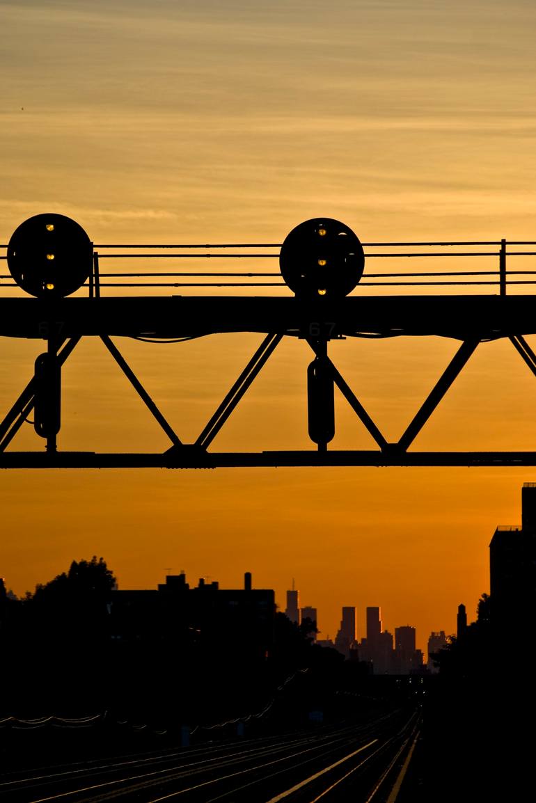 NYC skyline in morning light from train tracks in Queens.