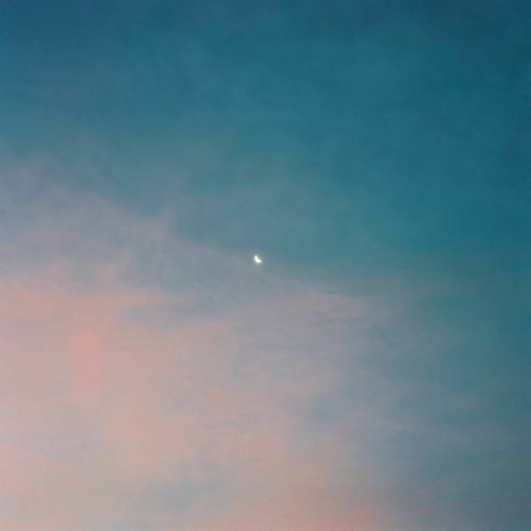 This analog photograph captures the moon in a vibrant, pastel sky during the daytime using medium format Kodak Ektar film. The delicate interplay of colors creates a dreamlike atmosphere, highlighting the subtle beauty of the moon in an unexpected setting. Shot on film in 2024 with a 70 y.o. medium...
