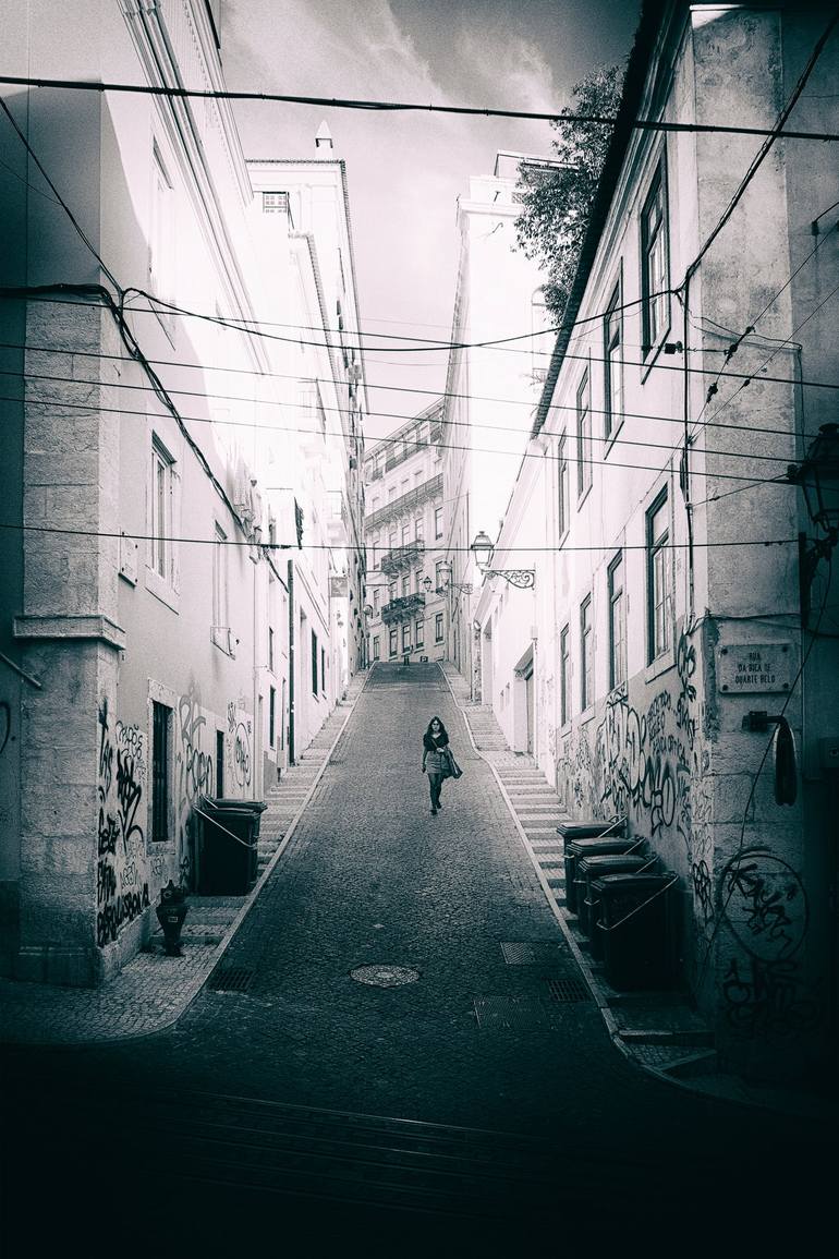 A lone figure descends one of the seven hills of Lisbon. Noir styled treatment was applied to the work to add a more atmospheric feel. A vignette was also used to pull the viewer into the image and emphasize the urban architecture of this street scene.
