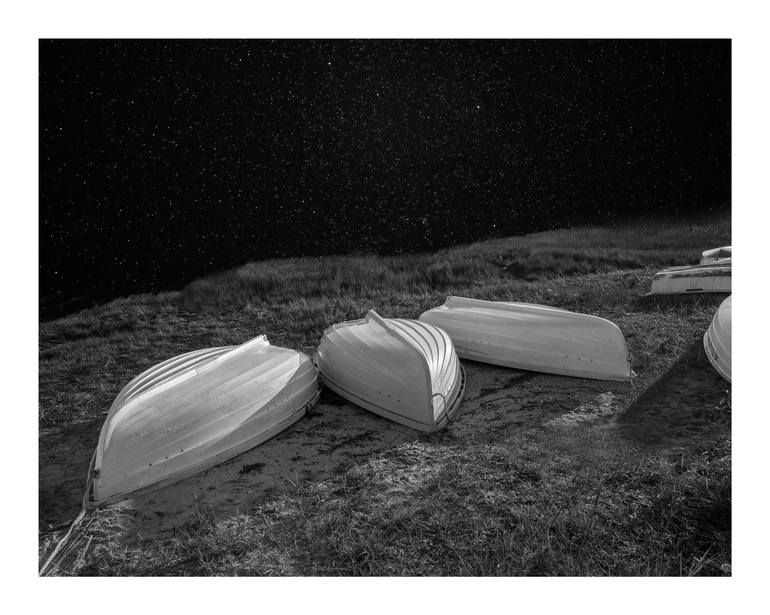 My black and white photomontage features overturned dinghies in Harwich, Massachusetts, backed by a starry sky. I wanted to present the boats as they might be seen if fully illuminated at night, while retaining the stars in the black sky. Since my youth, I have been fascinated by the night sky. I s...