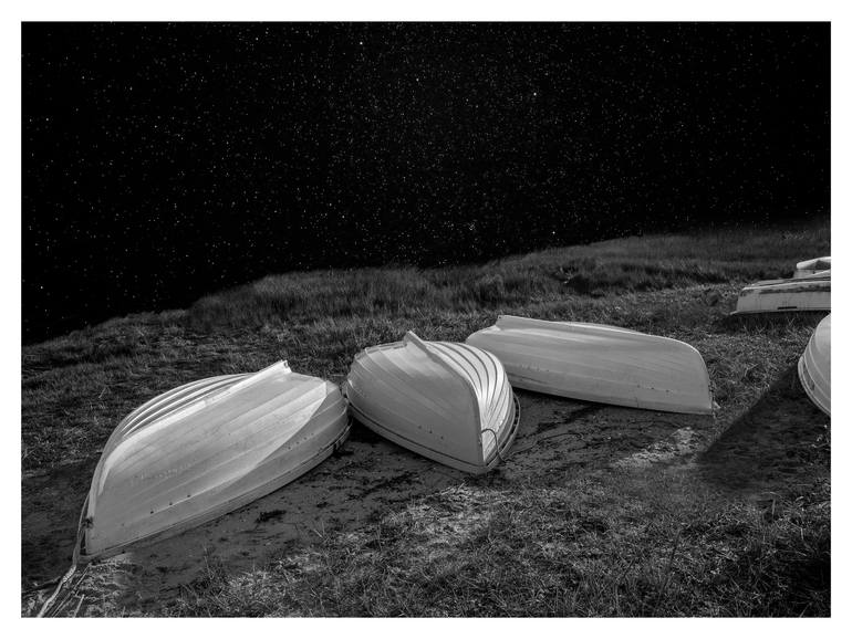 My black and white photomontage features overturned dinghies in Harwich, Massachusetts, backed by a starry sky. I wanted to present the boats as they might be seen if fully illuminated at night, while retaining the stars in the black sky. Since my youth, I have been fascinated by the night sky. I s...