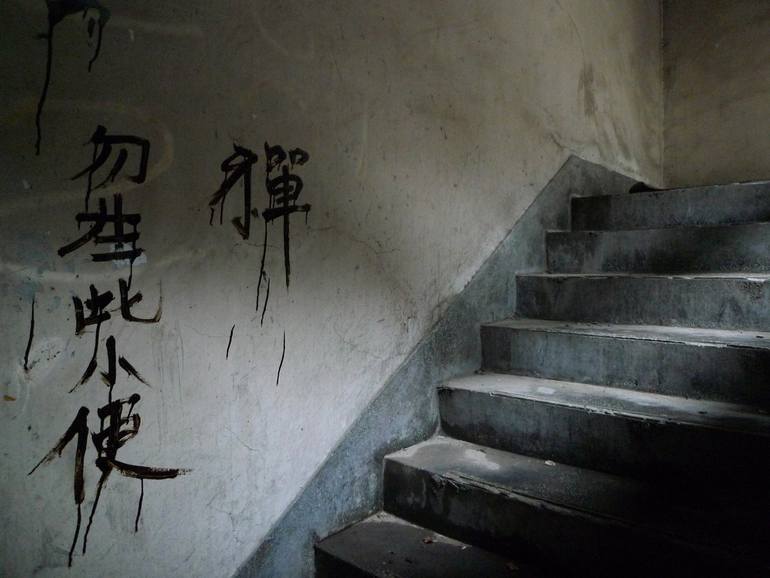 A beautifully dirty stairwell in Taiwan. The characters read, "Don't piss here. Zen."