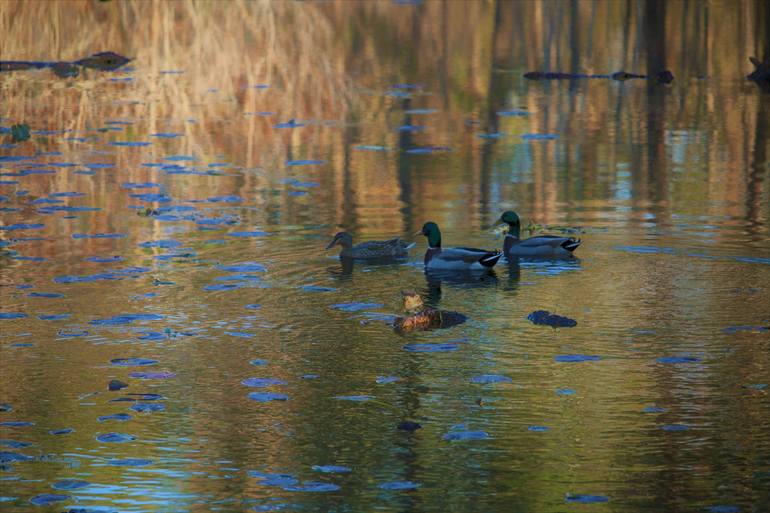 These persistent suitors seemed unaware of the romantic setting on the pond that day. The young lady kept paddling in and out of the shadows on this sunny day in February -- all to no effect.