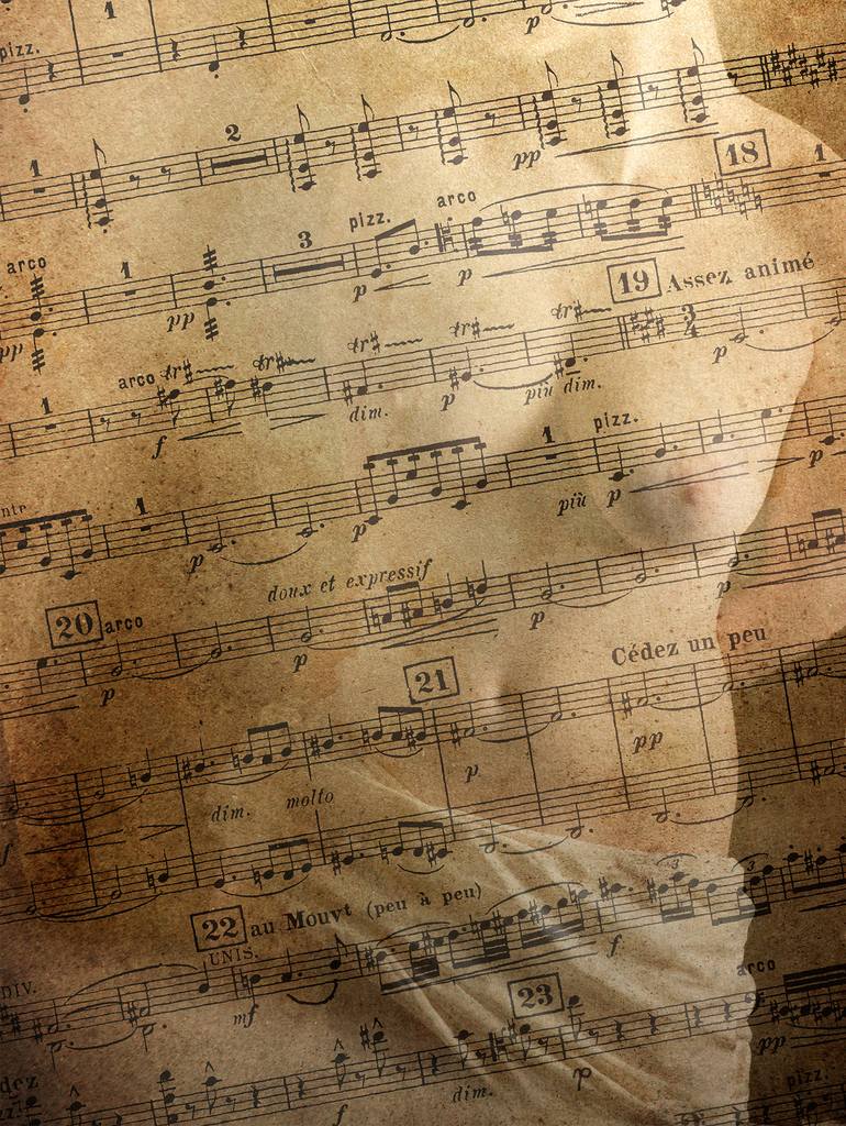 Composite image of nude model behind sheet music. Hand printed by the artist on beautiful, lightly textured fine art paper, 9x12 inches on 11x14.Number 1 of a limited edition of 9, signed and numbered on the front. Regarding size: My work is hand printed at the size I feel best presents the subjec...