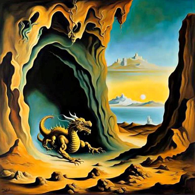 The A.I. created interpretation of a golden dragon is depicted emerging menacingly from a dark cave into a surreal landscape at sunset. The backdrop features a calm sea under an orange sky while fantastical cliffs and castle-like structures loom in the distance.