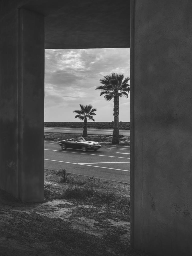 A Jaguar E-Type convertible passing under a bridge on pacific Coast Highway 101 outside of San Diego, CA.