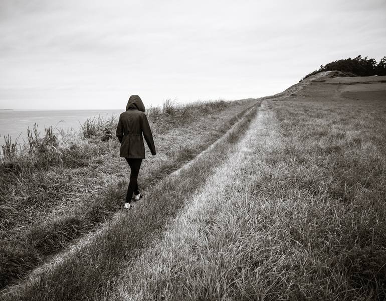 On a walk with my niece at Ebeys Landing, Whidbey Island along the Salish Sea in Washington State, USA. Her hooded rain jacket and the country road receding to the bluff made for a great composition and feel.