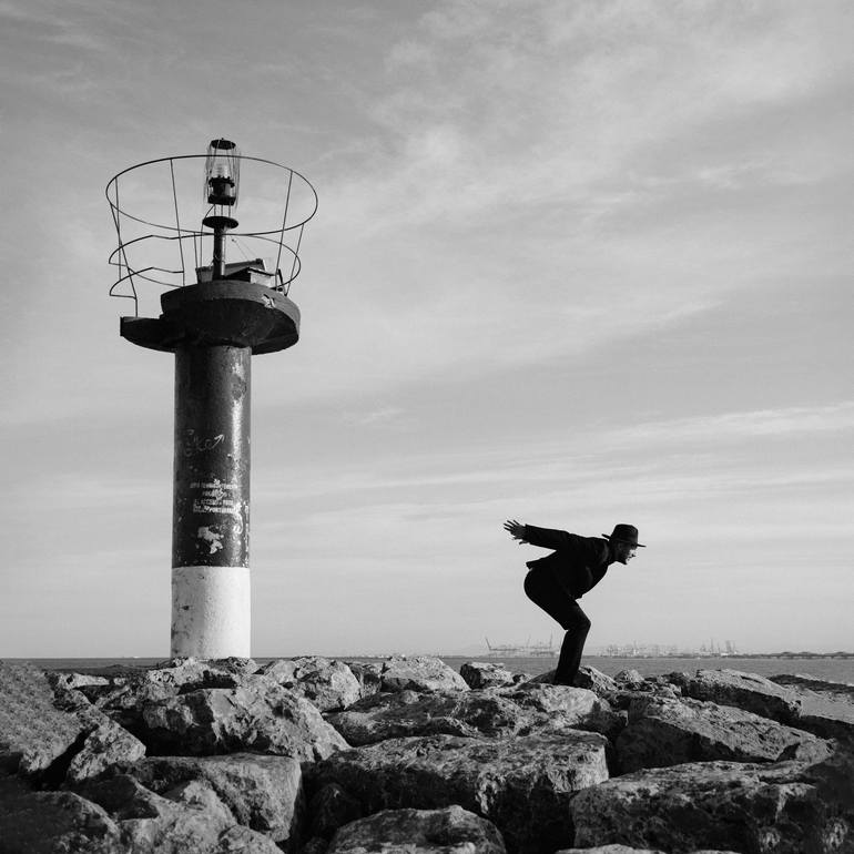 “El Faro” (The Lighthouse) is a playful yet poetic black-and-white photograph capturing a joyful interaction between human and landscape. The humorous silhouette of a person jumping beside the steady figure of the lighthouse symbolizes freedom, spontaneity, and the carefree nature of life’s fleeting...