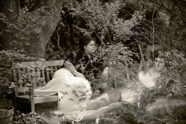The dream has direct references to the history of art and how the woman was portrayed and represented. In the image, I appear in dialogue with La maja dressed as Goya and make a nod to Rousseau's Dream, but in the paradise created by me, my garden.