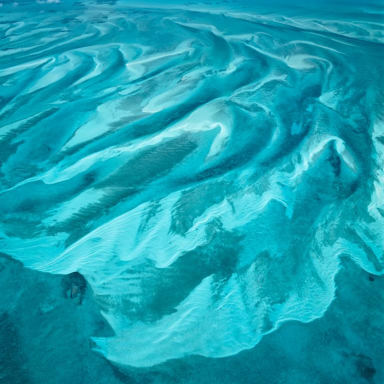 Aerial photograph of the Bahamas. The currents sweeping through the shallow waters around Eleuthera Island in the Bahamas have heaped up these elongated sand banks. The colour of the water changes depending on the depth of the sea – the deeper the sea, the darker the blue of the water. This aerial ...