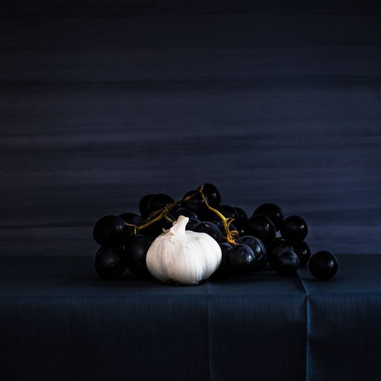 I am inspired by the still lifes of the old Dutch masters. Their handling of natural lights and shadows is a great source of inspiration for me. By positioning the contrasting colors of the used forms I search for a balance in composition. The shady blue of the background isolates the grapes and the...